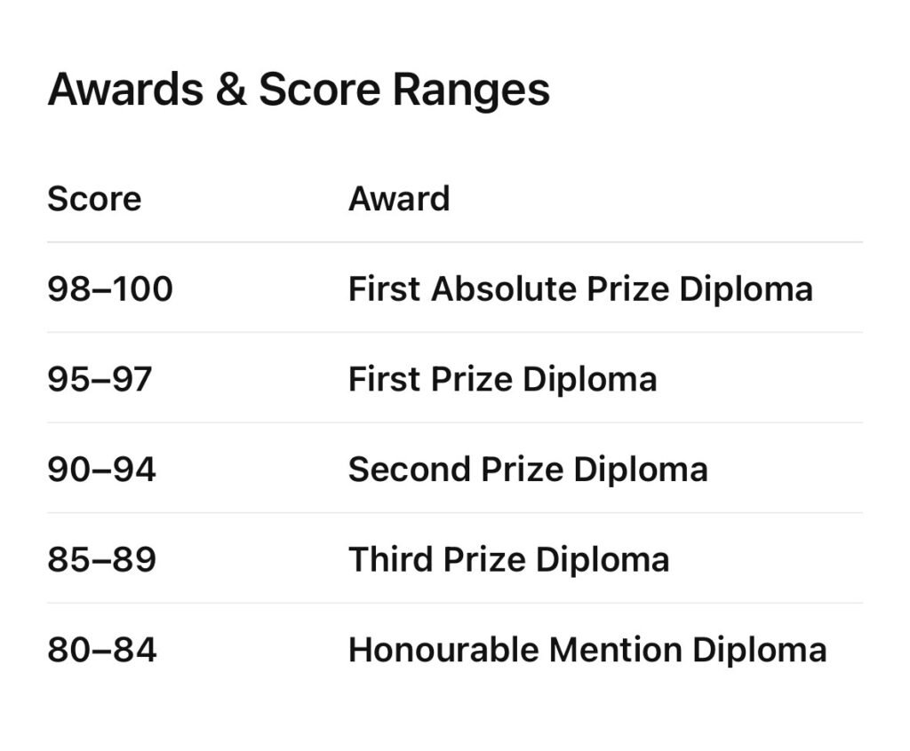 All 1st Absolute Prize winners will be awarded a beautifully crafted trophy and an elegant printed diploma (mailed to them) .